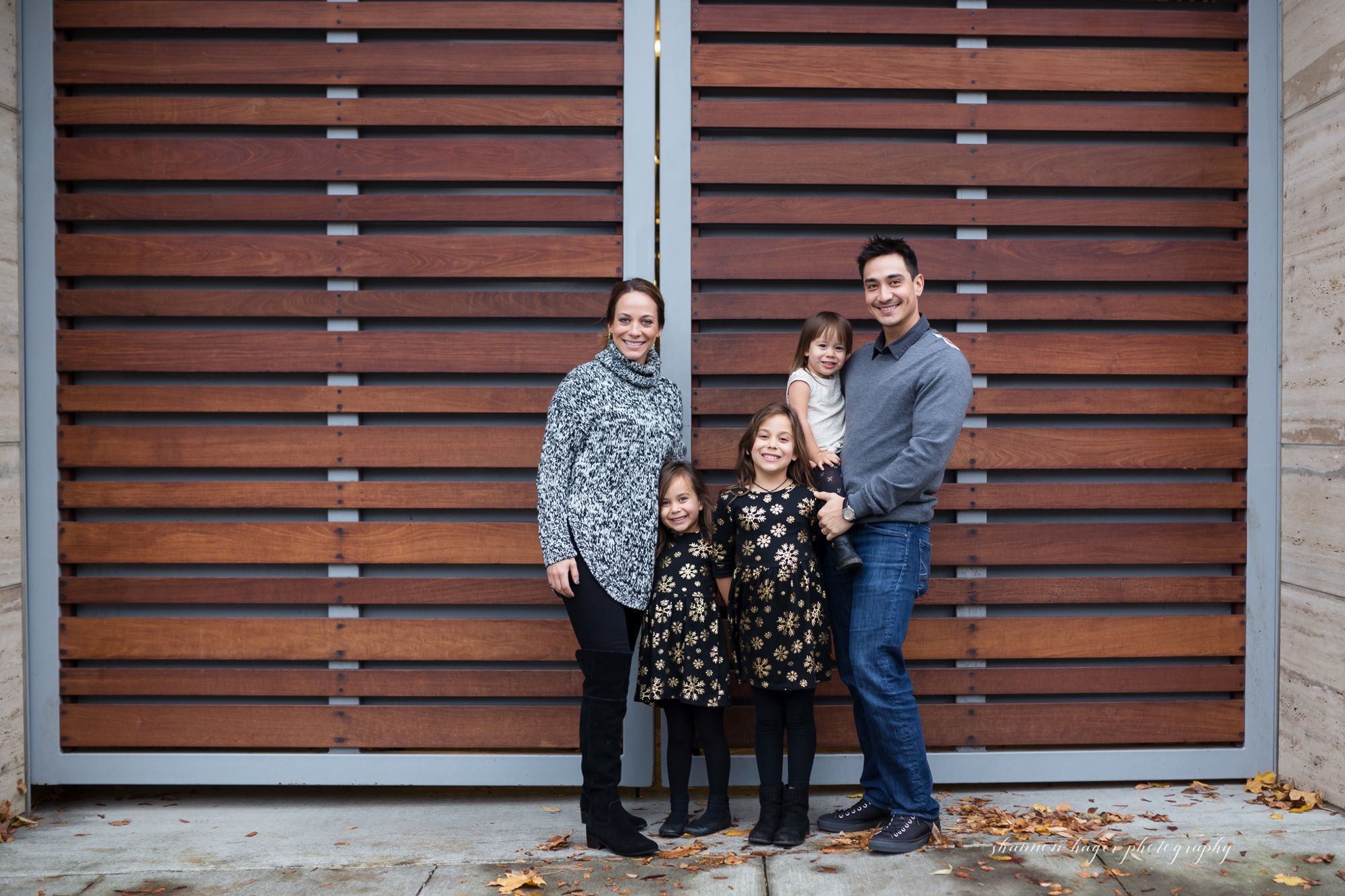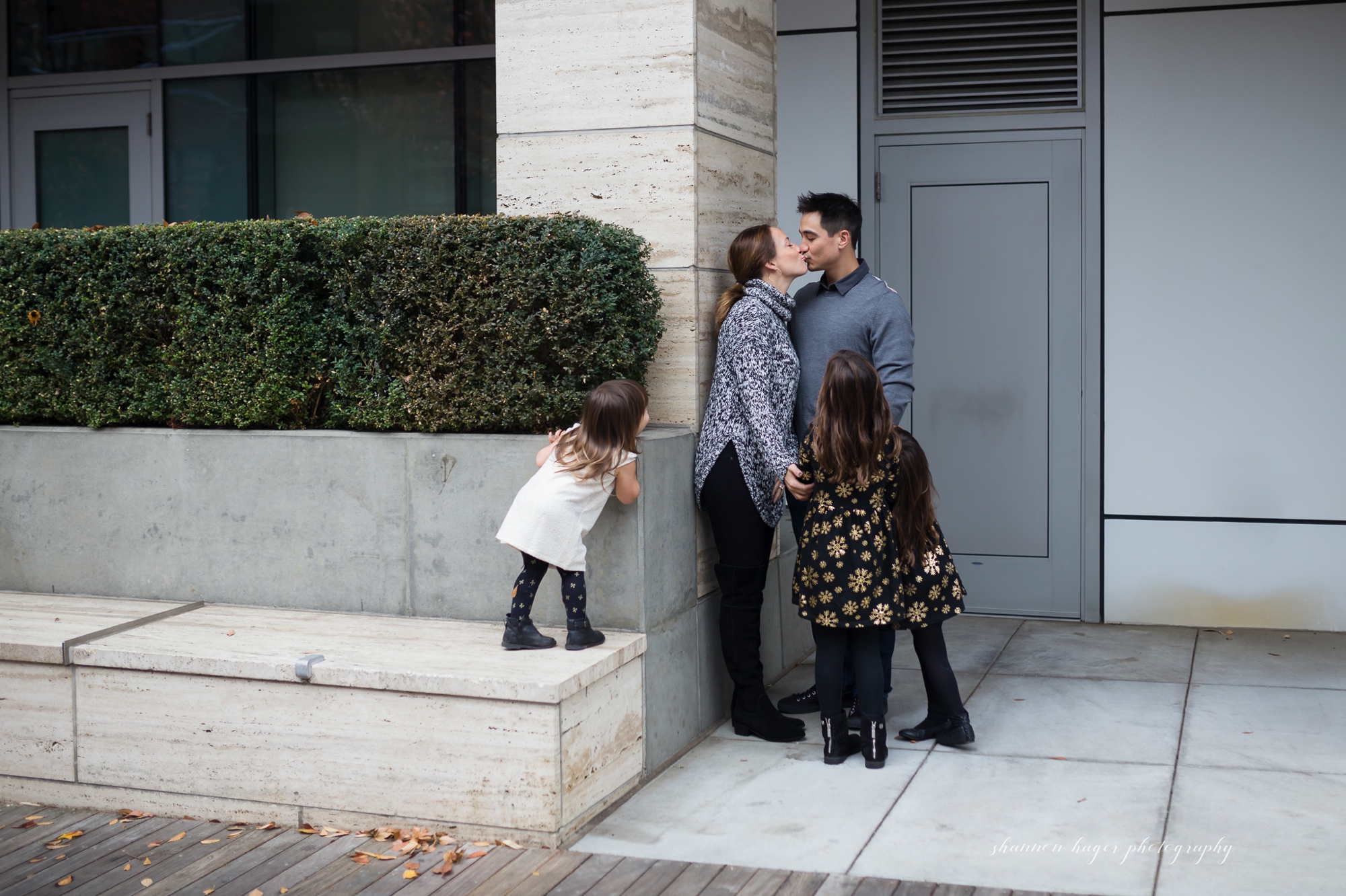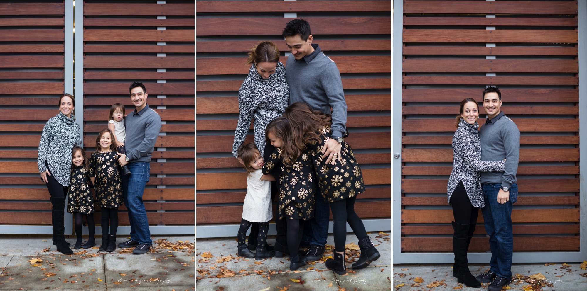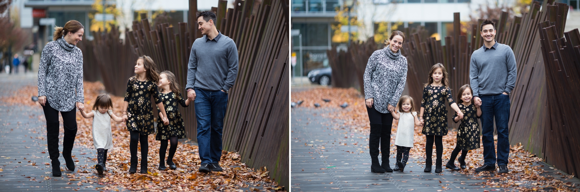 The Pearl District in Downtown Portland is one of the prettiest areas in the city. There are parks and trees, and so many different textures on the street and buildings. Tanner Springs Park is a beautiful city park with some very cool architecture. This is a great place for family photography sessions any time of year, but it is especially lovely in the fall. I met the Barney family in the Pearl District in mid-November. It was a little past prime fall colors but it was still pretty and we had great weather. I first photographed the Barney last year at a Christmas Tree Farm. We thought a more urban look for this years family photos would be a nice contrast.